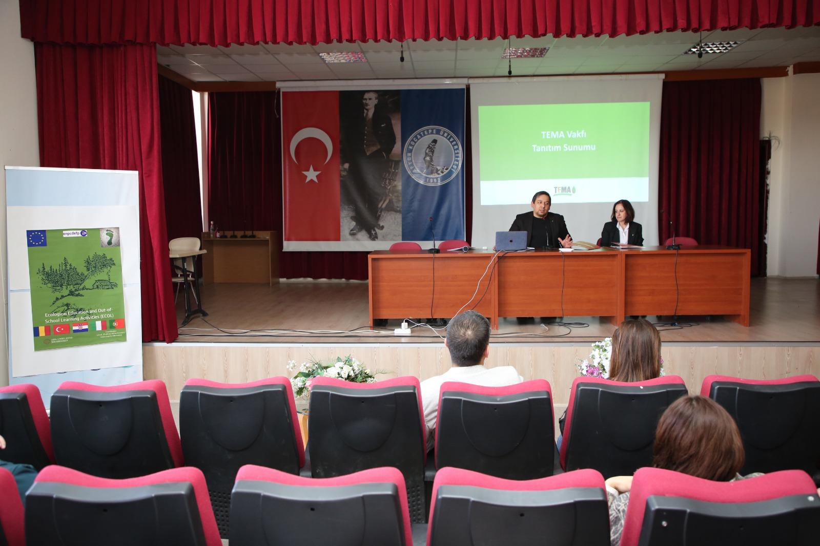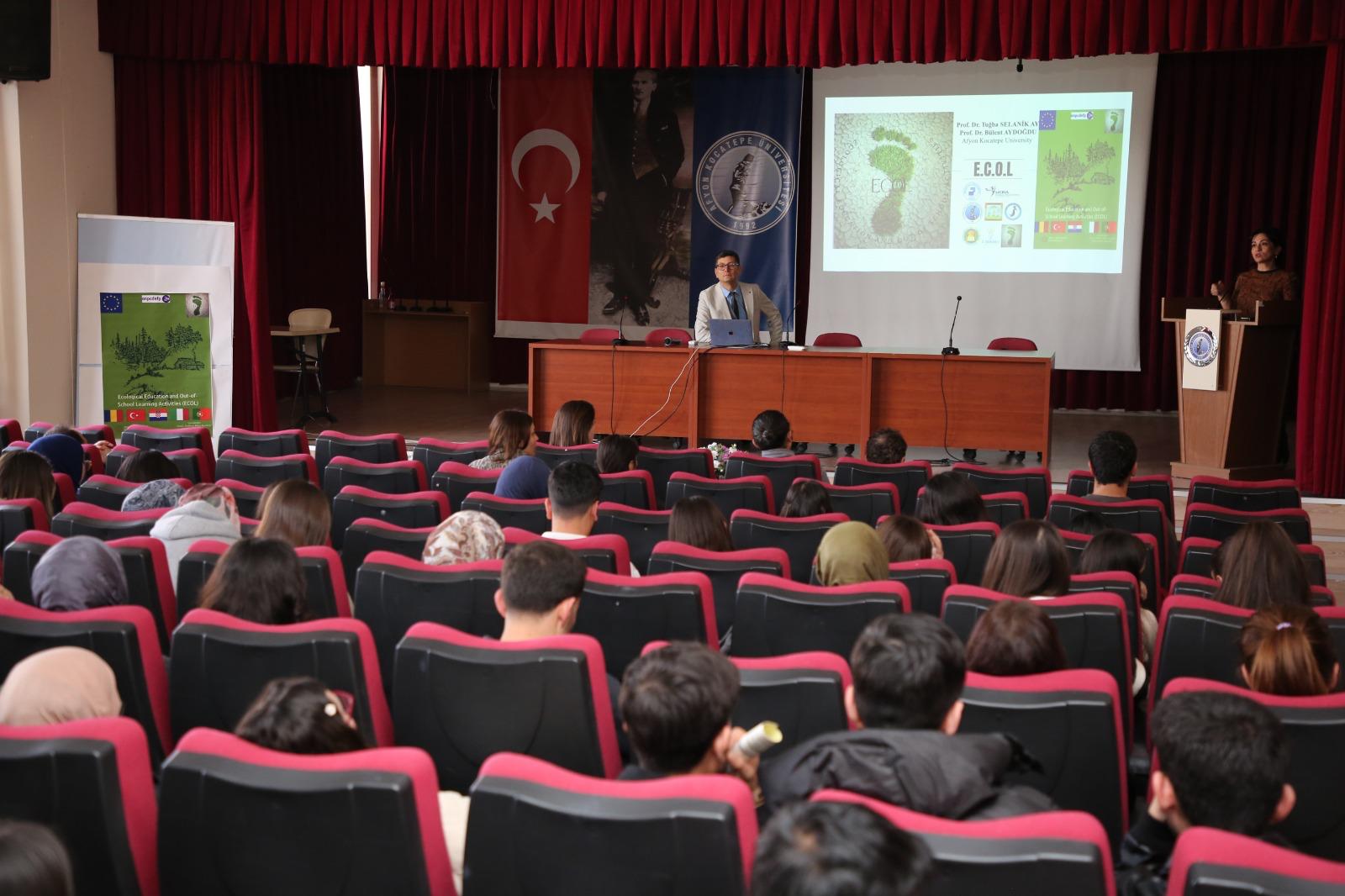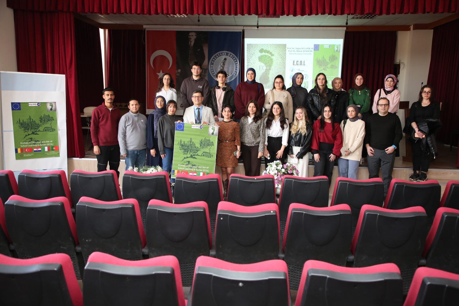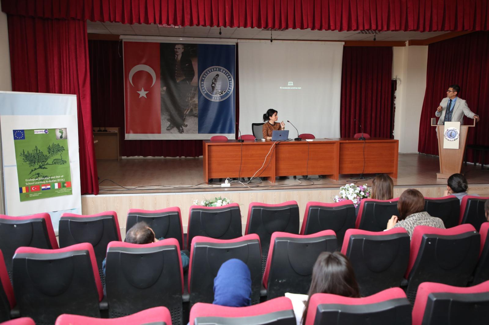 Üniversitemizin ortağı olduğu Erasmus+ KA220-SCH Okul Eğitimi programı kapsamında yürütülen “Ecological Education and Out-of-School Learning Activities (Ekolojik Eğitim ve Okuldışı Öğrenme Aktiviteleri)” başlıklı projenin yaygın etkisini artırmak amacıyla, proje yürütücüleri Prof. Dr. Tuğba Selanik Ay ve Prof. Dr. Bülent Aydoğdu tarafından 05 Mart 2026 tarihinde saat 13.30’da Eğitim Fakültesi Abdullah Kaptan Konferans Salonu’nda bir yaygınlaştırma faaliyeti gerçekleştirilmiştir. Etkinliğe yaklaşık 250 öğretmen adayı ile öğretim üyeleri katılım sağlamıştır.